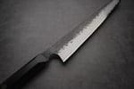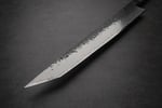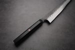 This Sujihiki features a 12-inch double-bevel blade of hardened stainless steel, forged in traditional San Mai construction for strength, balance, and refined cutting performance.